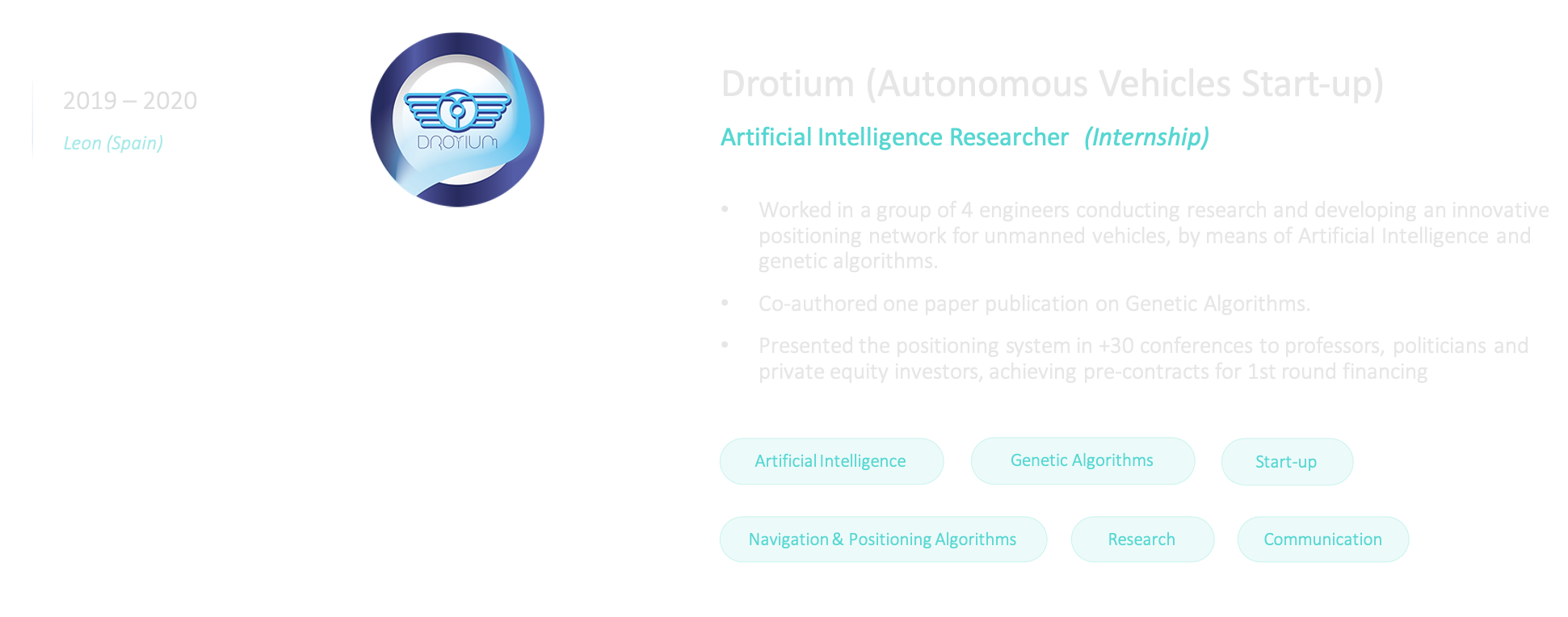 Prior to that, I interned as Satellite Control Engineer (TAS, France), as Astrodynamics Researcher (Germany Space Agency, DLR), and as Artificial Intelligence Researcher at the start-up Drotium (Spain).