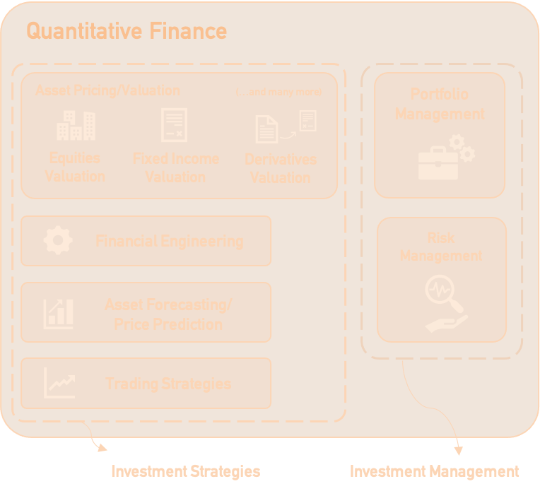 Courses in main quantitative finance fields: equities pricing, bond pricing and IR modeling, derivatives pricing models, volatility models, hedging strategies, portfolio optimization techniques, risk management, quantitative trading strategies.