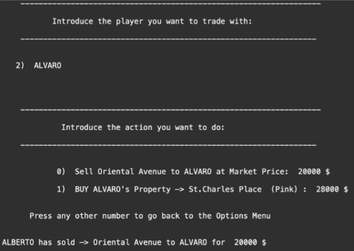 After the corresponding information has been displayed, the main options menu for each turn is shown. The menu offers all the available possibilities for the players. In case they are in a title deed square, the BUY option is first displayed. If they want to see their properties first before buying, they can access the manage properties option, which automatically displays all the title deeds that the player has in possession. After selecting any of them, a new menu emerges, this time showing additional options on building or selling houses and hotels, or going back to the main options menu. Moreover, it is possible to access to further actions, encompassed under the "trade property" option. This will allow the player to sell the selected property to any other player, or to buy other properties belonging to any other player.