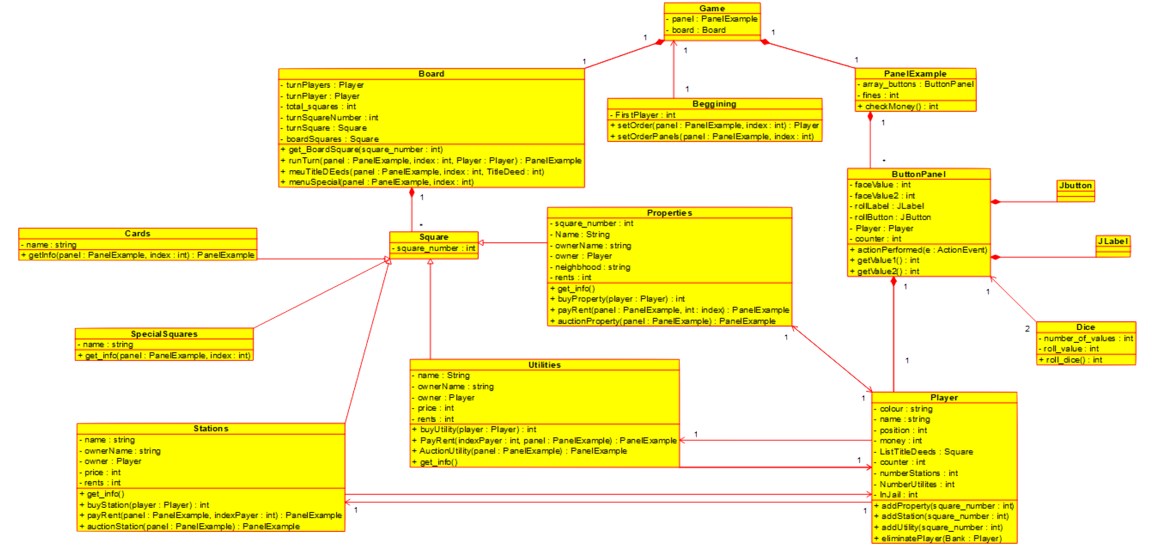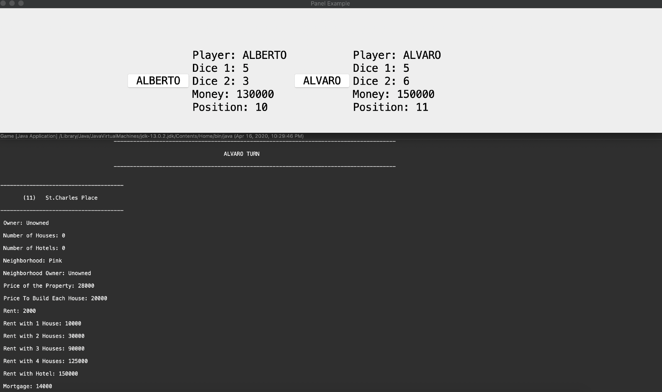 The program aims to simulate the popular board game "Monopoly". The main interface of the program is the command line, which displays all the information relative to the game, and allows us to navigate through the menus and introduce information. In addition, an extra Java Panel has been added to the interface of the command line, which will allow the players to throw the dices each turn, and will show the information relative to the players at all times (name, dices, money and position in the board), in order to make it simple for the users to quickly know the situation of the game at a glance.