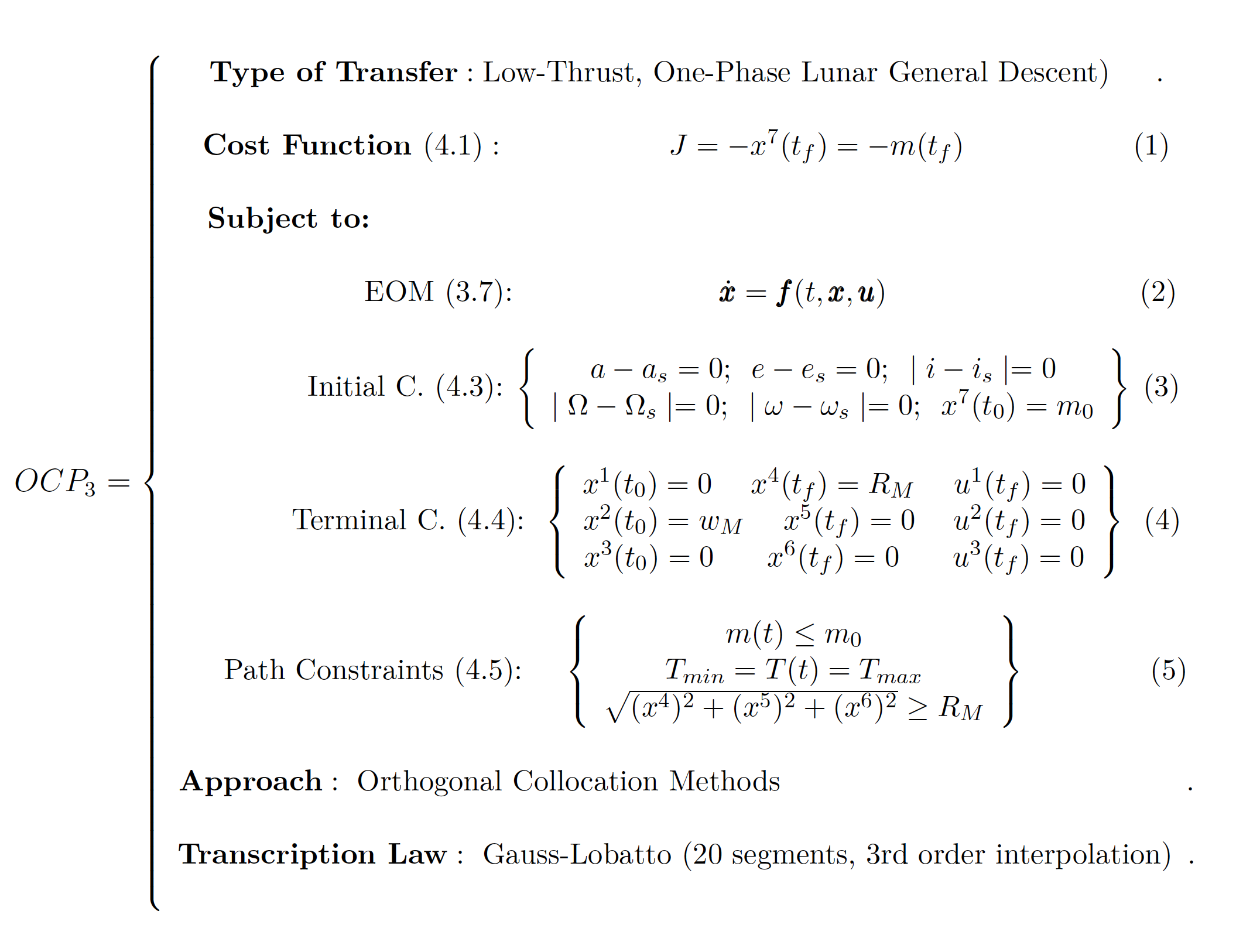 The procedure to be followed in this section will be identical to the followed for the ascent trajectories. The general lunar descent is formulated in OCP3, and considers a one-phase descent with constant thrust.
