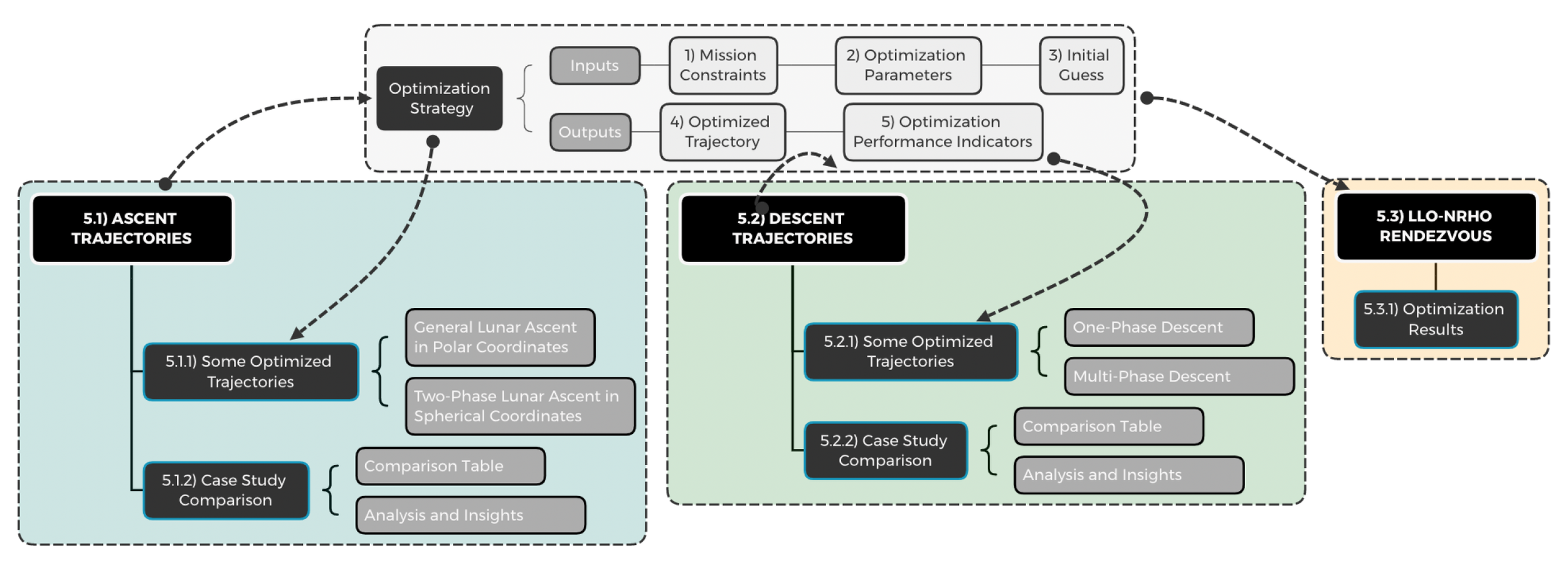 Figure below exhibits the process followed to obtain the optimization results, applying the optimization strategy process described in 5.1 to the ascent, descent and rendezvous trajectories. The process can be divided in 3 main stages: i) Optimization of Ascent Trajectories, ii) Optimization of Descent Trajectories, and iii) Optimization of LLO-NRHO Rendezvous.