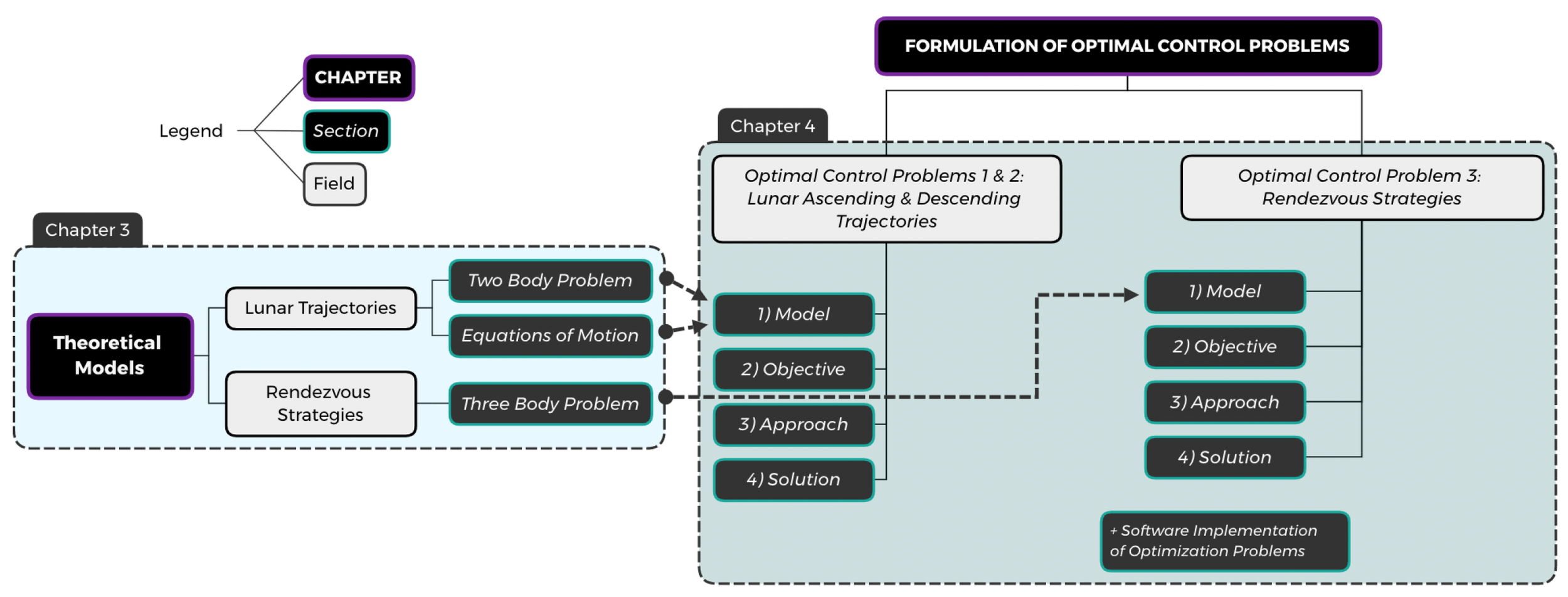 The objective of this chapter is to cover in a succinct way the main theoretical concepts that will lay the foundations for the present investigation. As previously defined in Figure 2.13, any optimization problem can be divided in 4 steps. This chapter aims to define the first step of the optimization problem—the mathematical models —for the three types of optimization problems (OCP) that comprise the present project: the lunar trajectory optimization problem (OCP1 and OCP2), and the rendezvous optimization problem (OCP3). Upon definition of the models theoretical background, chapter 3 will define the Optimal Control Problems of study.