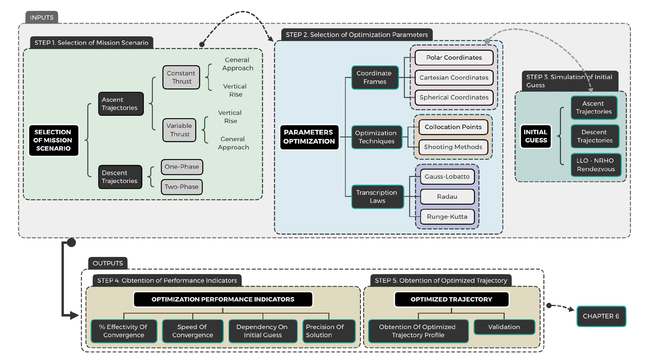 In the first place, the inputs are defined. The different mission scenarios were defined, in order to determine the objectives and details of the mission. Next, the optimization problem was defined according to the 4-step approach defined in past chapters. Next, the different optimization parameters (i.e. coordinate frames, optimization techniques and transcription laws) were compared. Finally, once the optimization problem was completely formulated, the outputs were determined. The optimization performance indicators that measure the quality of the optimization will be presented at the end of the present chapter, together with the optimization results for each mission and configuration type.