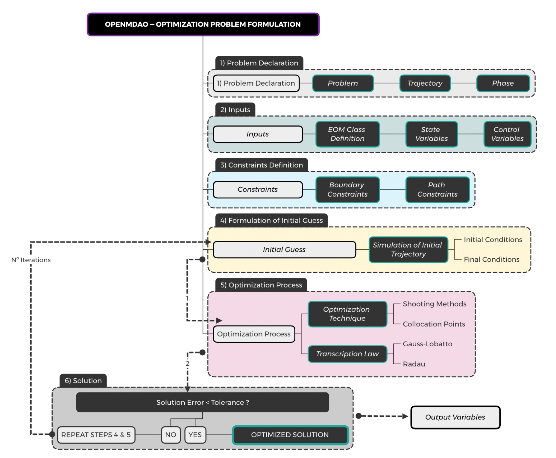 Figure 4.2 provides the general scheme of the optimization process, organized according to the 4-steps and the different optimization parameters that they present. This general approach comprises the formulation of the mathematical model of the problem, the definition of the principal objectives, the development of a suitable approach to reach those objectives, and the process to achieve the solution of the optimal problem (approached with library OPENDMAO).