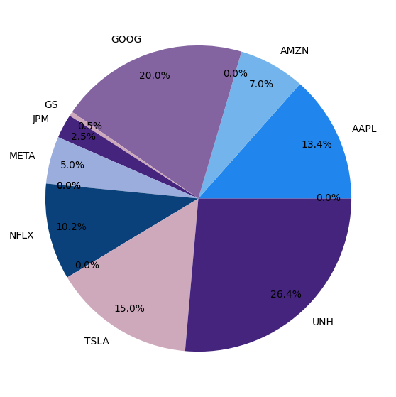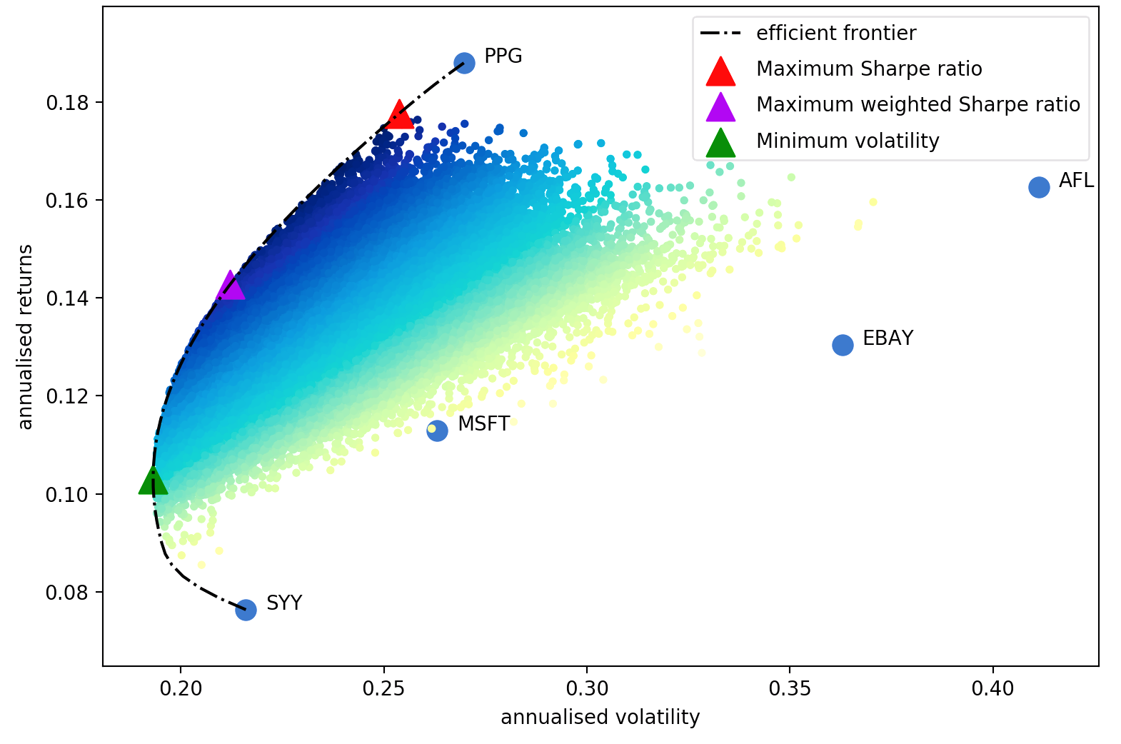 PyFinPo also offers the option to express portfolio optimal weights in a more visual, tidy way with the .clean_weights() method (see PyFinPO-UserGuide).