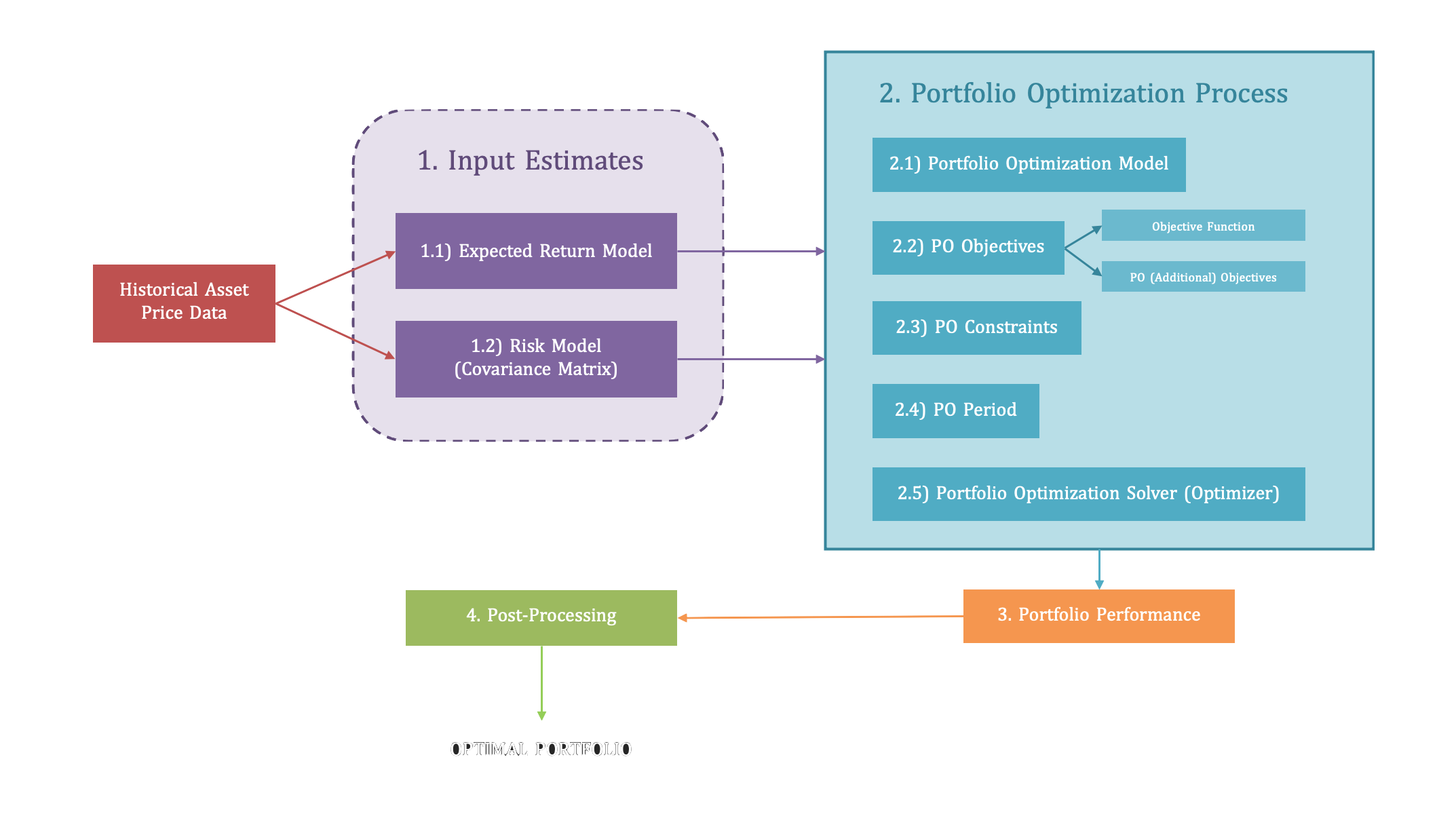 Building from the basic steps of Portfolio Optimization Theory, we can divide portfolio optimization process in 4 main steps, each with their own sub-steps. These are depicted in the Figure below, and fully detailed in the following section.